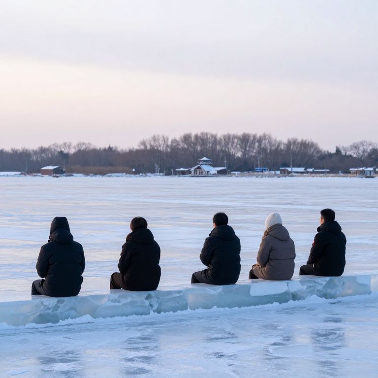 Five individuals sit contemplatively on ice blocks amidst a vast frozen landscape, their figures framed by a serene expanse of snow and distant trees under a pale sky.