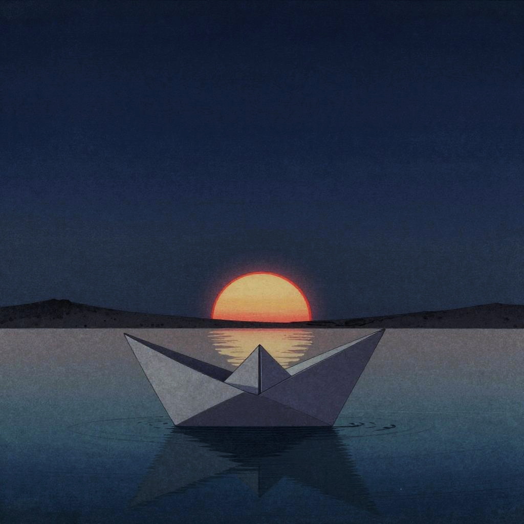 In a moonlit salt flat, a paper origami ship sails gracefully across the horizon, as the sun sets, casting a warm glow over the water, captured in a minimalist ukiyo-e woodblock style.