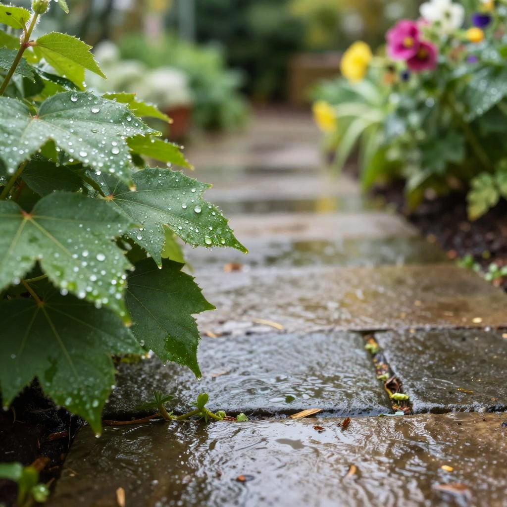 Clean.up pictures capturing a pristine outdoor garden pathway after rain, with dew drops glistening on fresh leaves, smooth stone path cleared of debris, vibrant flowers, and an overall feeling of freshness and renewal.