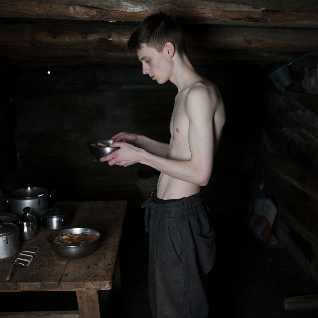 Side view of a very thin and frail young man with short dark hair and pale skin, standing in a dimly lit isolated mountain hut. He holds a metal bowl of stew halfway up, wearing loose dark pants. The rustic interior features rough wooden beams and a wooden table with another bowl of stew and metal pots in the background. Gloomy lighting emphasizes the somber and raw atmosphere.