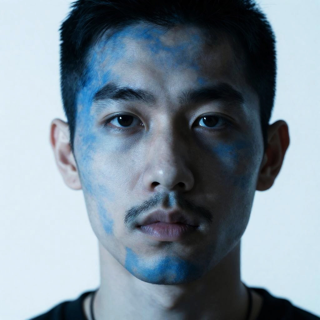 Close-up portrait of an Asian man with short dark hair and a mustache, featuring blue-tinted skin on his face. He has an intense gaze with slightly parted lips, and the right side of his face is shadowed against a plain white background. The lighting is high contrast, emphasizing facial features and skin texture.