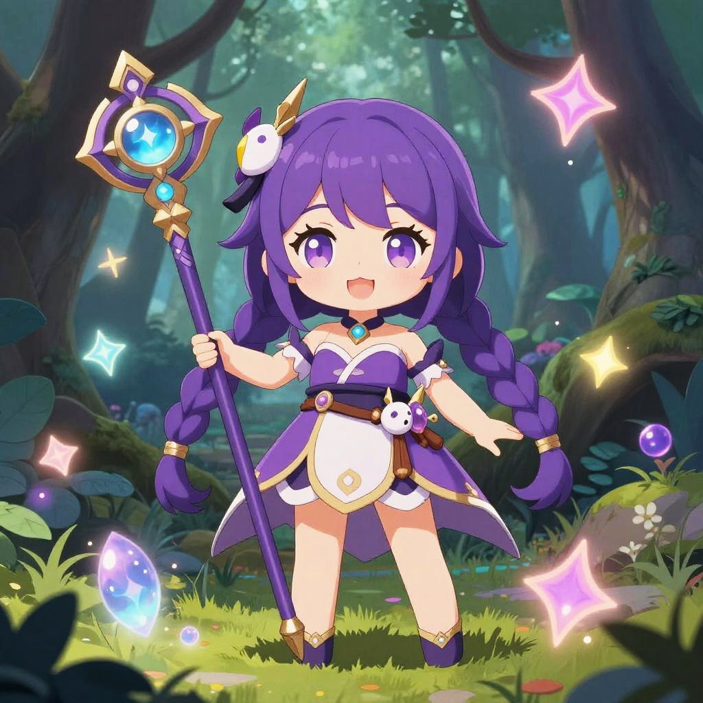 Green eyes purple hair anime girl in a magical forest, ethereal glow, enchanted atmosphere, intricate costume with floral patterns, high detail, vivid colors