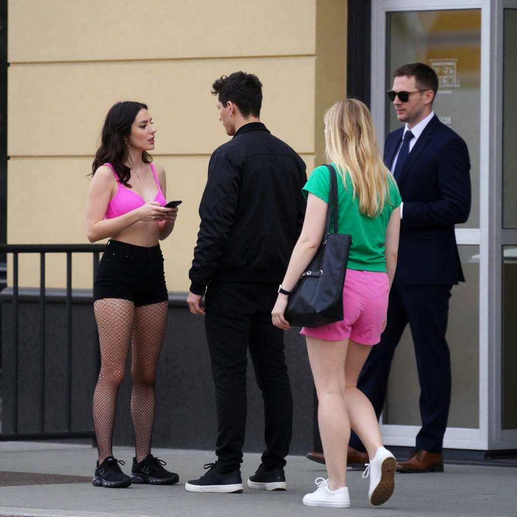 Photograph of four people outside. Dark-haired woman in pink bra, black shorts, fishnet stockings, talking to man in black jacket. Blonde woman in green top, pink shorts, black bag, walks by. Second man in dark suit, sunglasses, stands near glass booth. Urban background with yellow wall, black railing. All people facing forward, engaged in different activities.