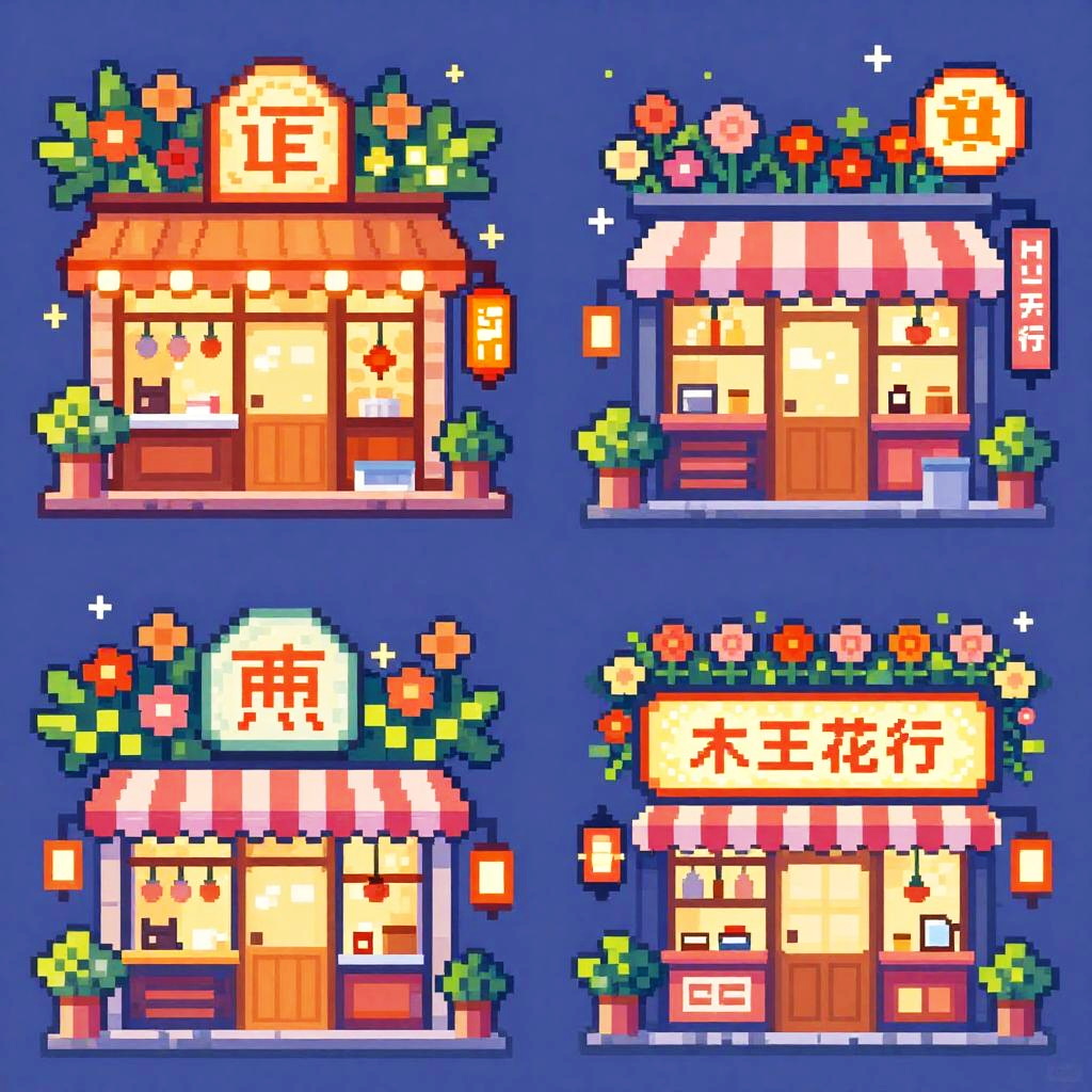 Pixel art of four colorful Asian-style shops with red and white awnings, floral decorations, lanterns, and Chinese characters on signs.