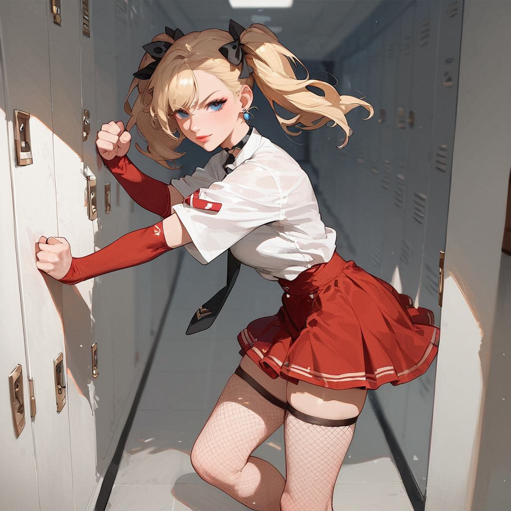 Digital anime-style illustration of a blonde woman with twin pigtails, wearing a white short-sleeve shirt, red tie, red pleated skirt, and red long-sleeve gloves. She has fishnet stockings and black garters. She is positioned in a narrow, dimly lit hallway with grey lockers on both sides, leaning against the lockers with a determined expression. The lighting creates sharp shadows, emphasizing her curves and the texture of her outfit. Her blue eyes and red lipstick contrast with her fair skin. The image has a vibrant, dynamic feel with a focus on her confident, slightly provocative stance.