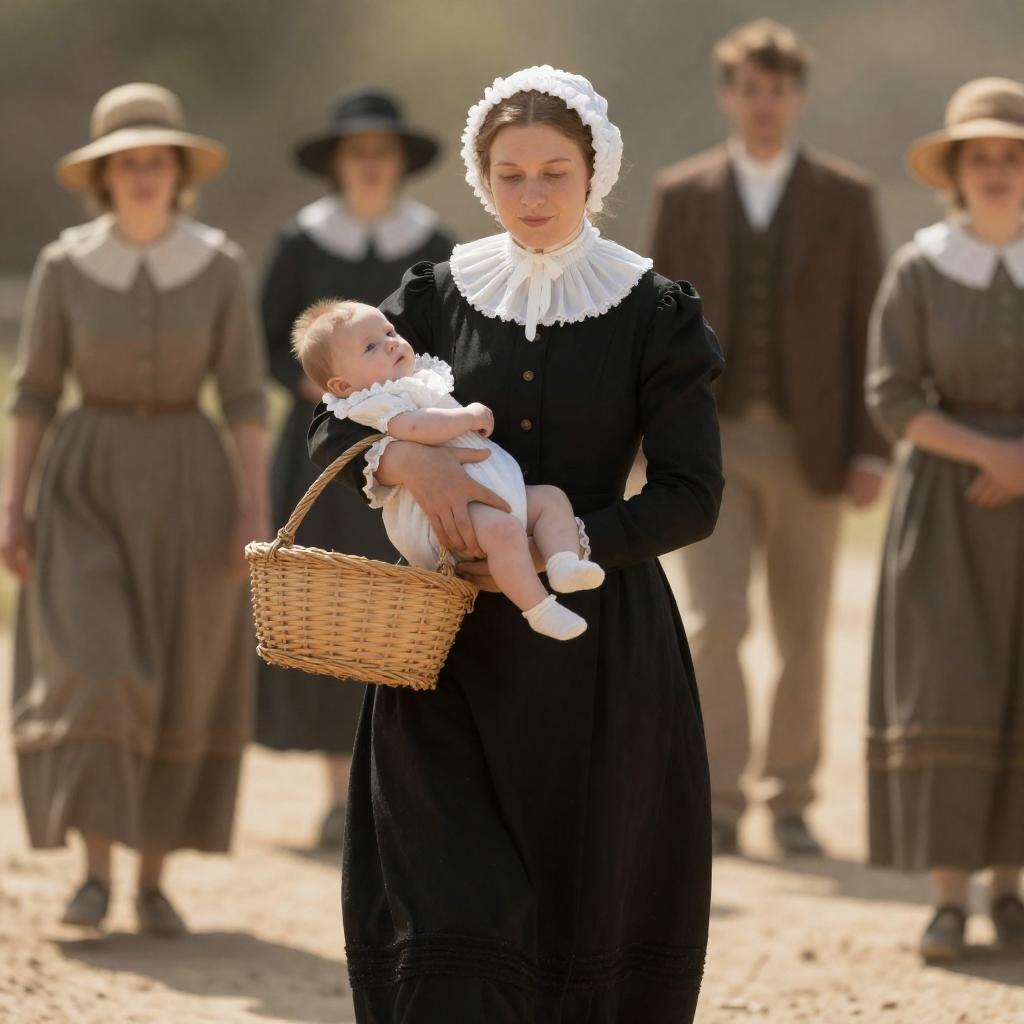 Photograph of a man and woman in a historical setting. Man, with light brown hair, gray tweed jacket, brown scarf, beige vest, and white shirt, stands behind the woman, his hand on her shoulder. Woman, with white bonnet and pink-striped dress, head bowed, eyes closed, leaning against him. Blue walls, candle sconce, landscape painting, and vase of pink flowers in background. Man's expression is gentle, woman's expression is sad. Both are light-skinned.