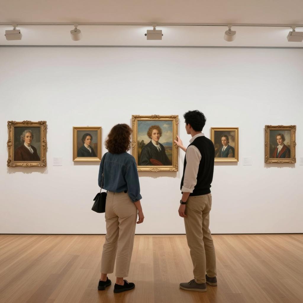 A man and woman stand in a modern art gallery with wooden flooring and white walls, observing a collection of six framed classic portraits. The woman has curly brown hair, wearing a blue jacket, beige pants, and black shoes, while the man has short black hair, dressed in a white shirt, black vest, beige pants, and gray shoes. The man is pointing towards one of the portraits as they engage with the artwork under ceiling spotlights.