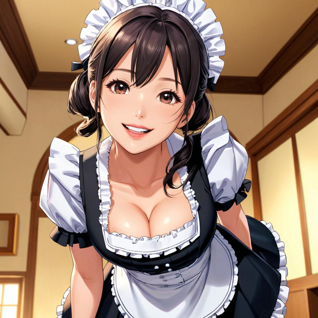 Anime-style digital illustration of a blonde, cat-eared maid with a black and white outfit, kneeling, smiling, waving, and blushing. Hearts