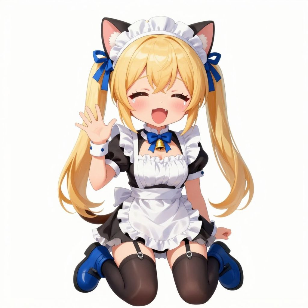 1girl, best quality, blue ribbon, blue footwear, bell, open mouth, cat tail, white background, full body, waving, chibi, blush, cat ears, maid, tears, wristband, medium breasts, boots, kneeling, facing viewer, thighhighs, blonde hair, maid headdress, >_<, fangs, twintails, animal ears, tail, cleavage, solo focus, breasts, zettai ryouiki, garter straps, frills, closed eyes, black legwear, ahoge, ribbon, simple background, choker, masterpiece, newest, absurdres, sensitive