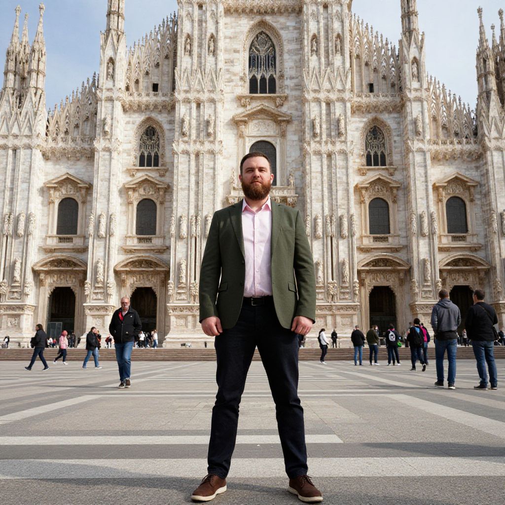 A photograph of a bearded man with short brown hair, wearing a black shirt, standing in front of a towering, ornate Gothic cathedral with intricate stone carvings and pointed spires. The bright blue sky provides a clear contrast to the white stone of the cathedral. The man's expression is neutral, and he's positioned in the foreground, with the cathedral dominating the background.