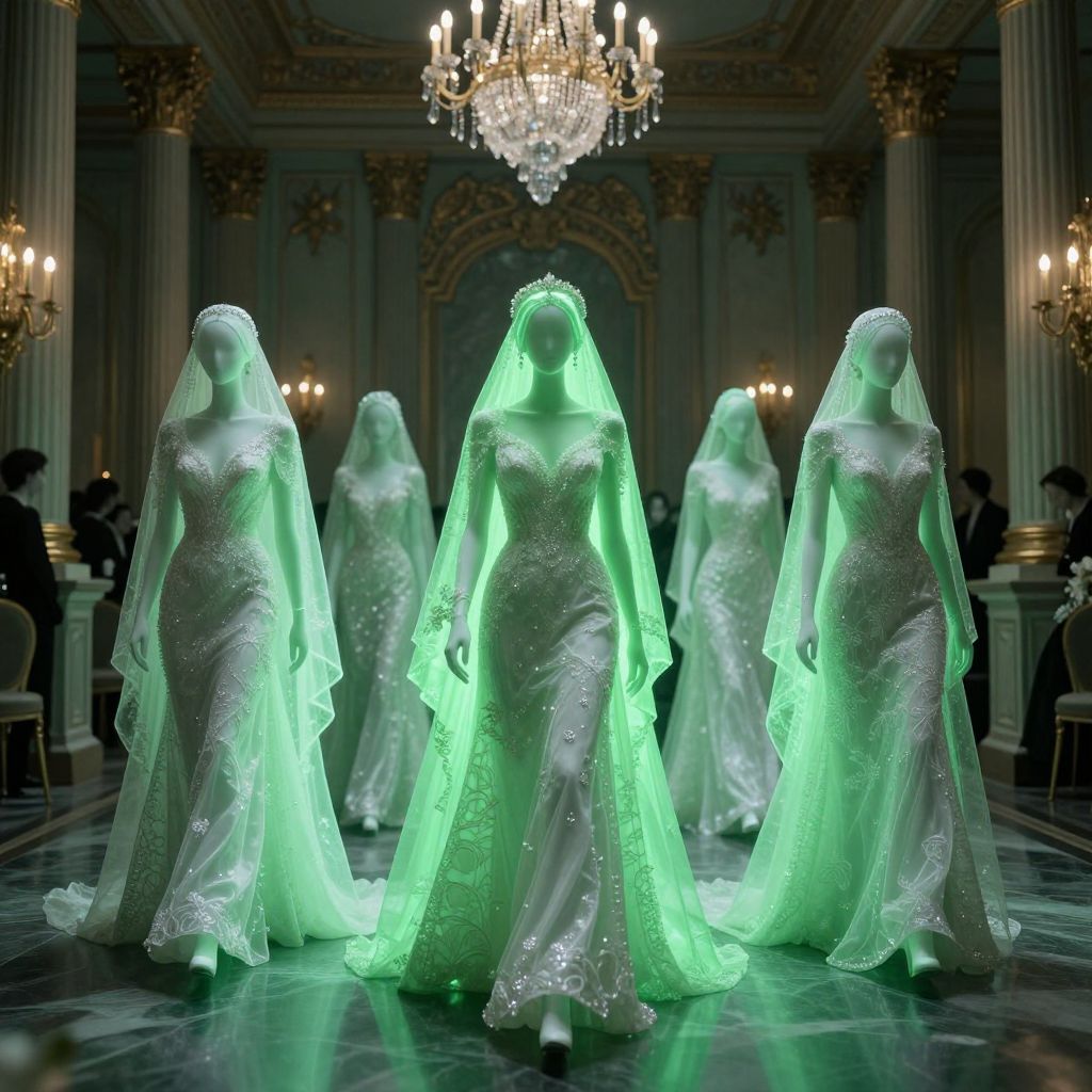 Photograph of five glowing green mannequins in luminous, white, beaded wedding dresses with veils, standing in an opulent ball