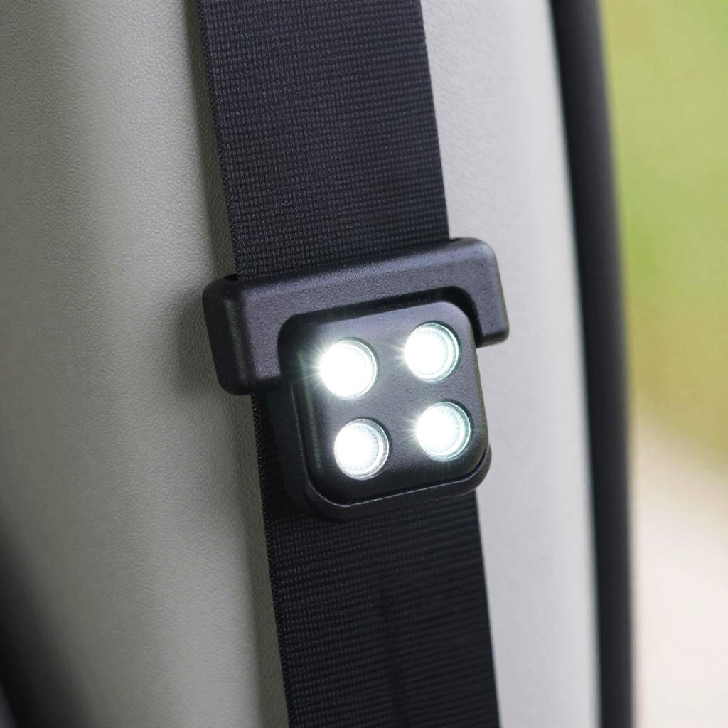 Close-up of a black car seatbelt buckle featuring four bright white LED lights. The textured black seatbelt strap contrasts with the grey car seat upholstery. The background is blurred with white and green hues, indicating an outdoor setting. The image highlights the buckle's sparkling LED effect.