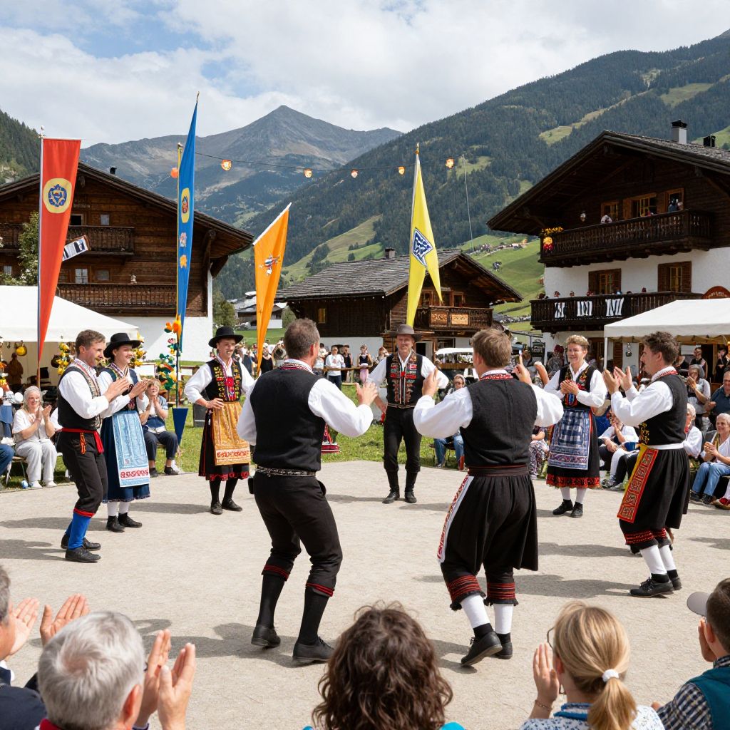 Yordels competing in a lively village festival yodeling contest, traditional costumes with embroidery, rustic wooden stage, enthusiastic audience clapping, alpine mountains behind, colorful banners and flags, bright daylight, festive and spirited environment