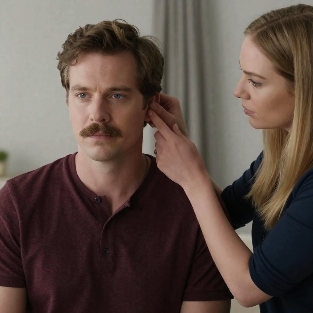 Photograph of a man with brown hair, mustache, and blue eyes wearing a maroon shirt, being gently touched on the ear by a blonde woman with long hair in a navy blue top. Background shows blurred indoor setting with curtains. Man has neutral expression, woman has intense, focused expression.
