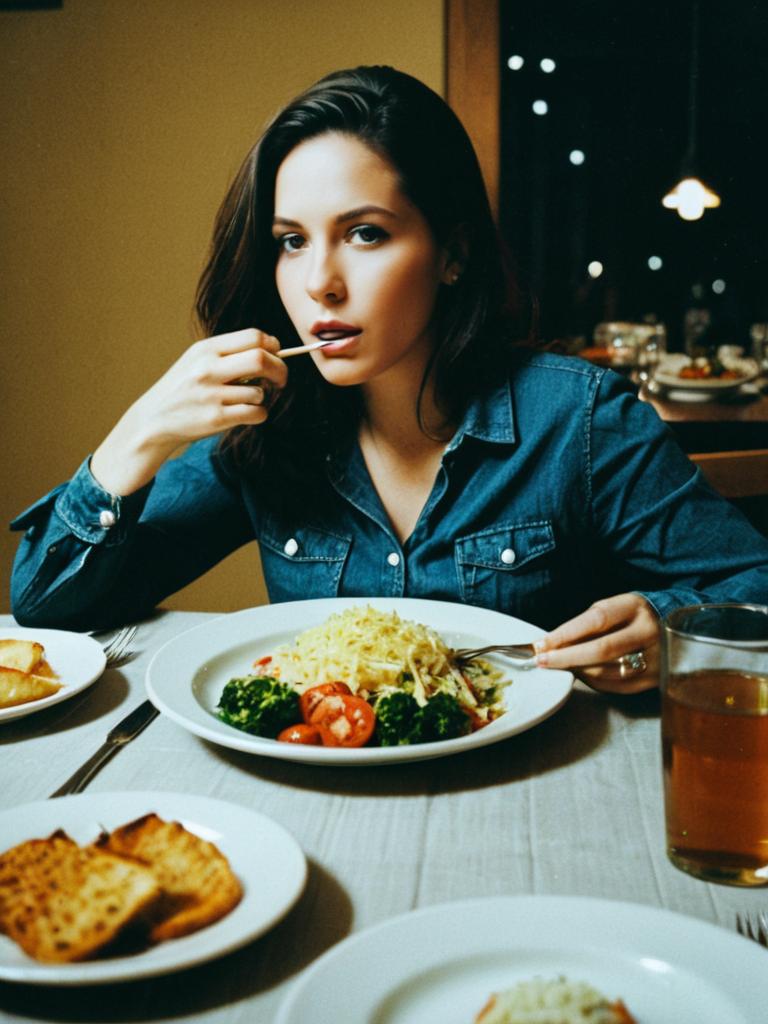 Casual Dinner Outfit, woman sitting at a table with a plate of food in front of her