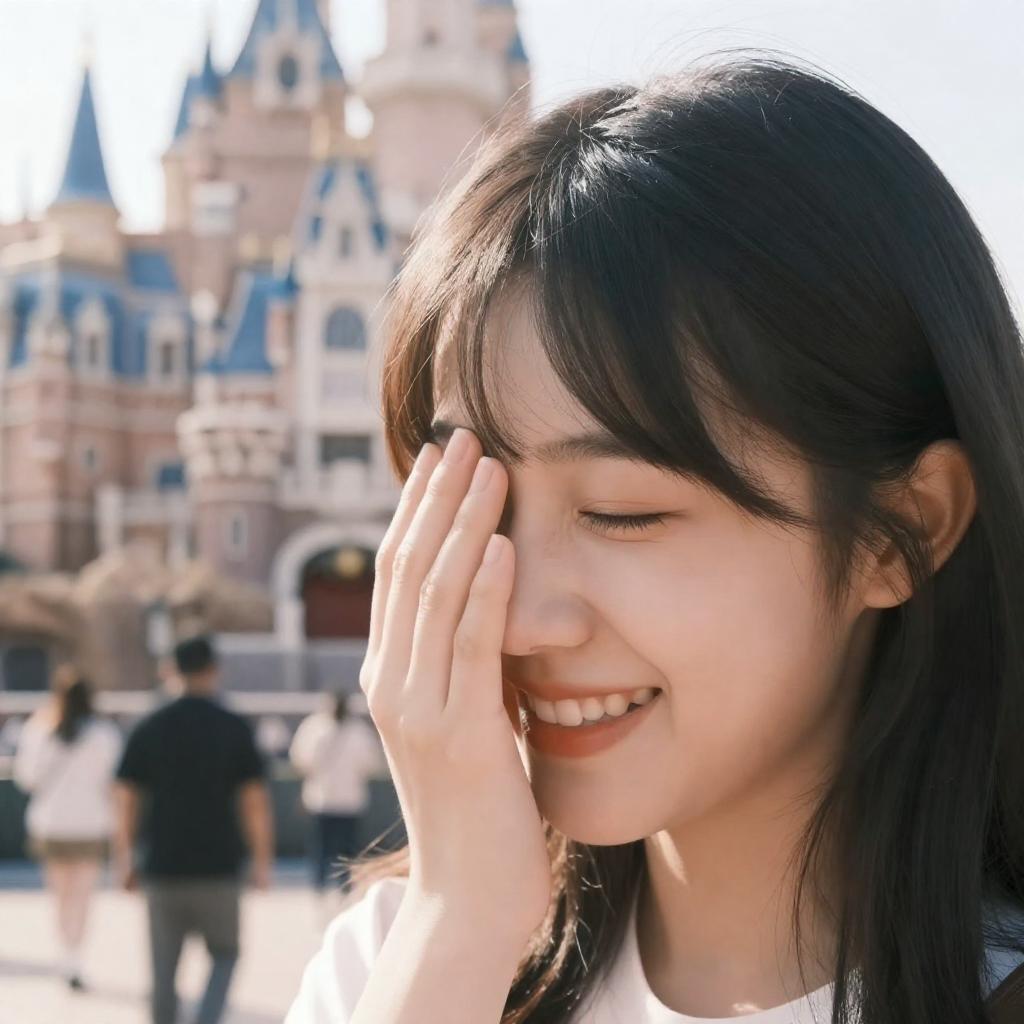 Embarrassed, detailed beautiful face, girls, dating in disneyland, cinematic light, smile, sunlight, light aura, bokeh