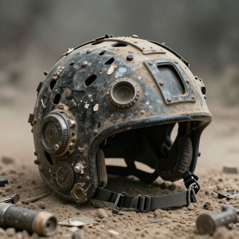 Make your own helmet, post-apocalyptic survivor assembling a rugged, improvised helmet from scrap materials and scavenged tech parts, gritty and worn textures, smoky, dusty atmosphere with muted color tones, detailed focus on helmet’s protective features and resilience.